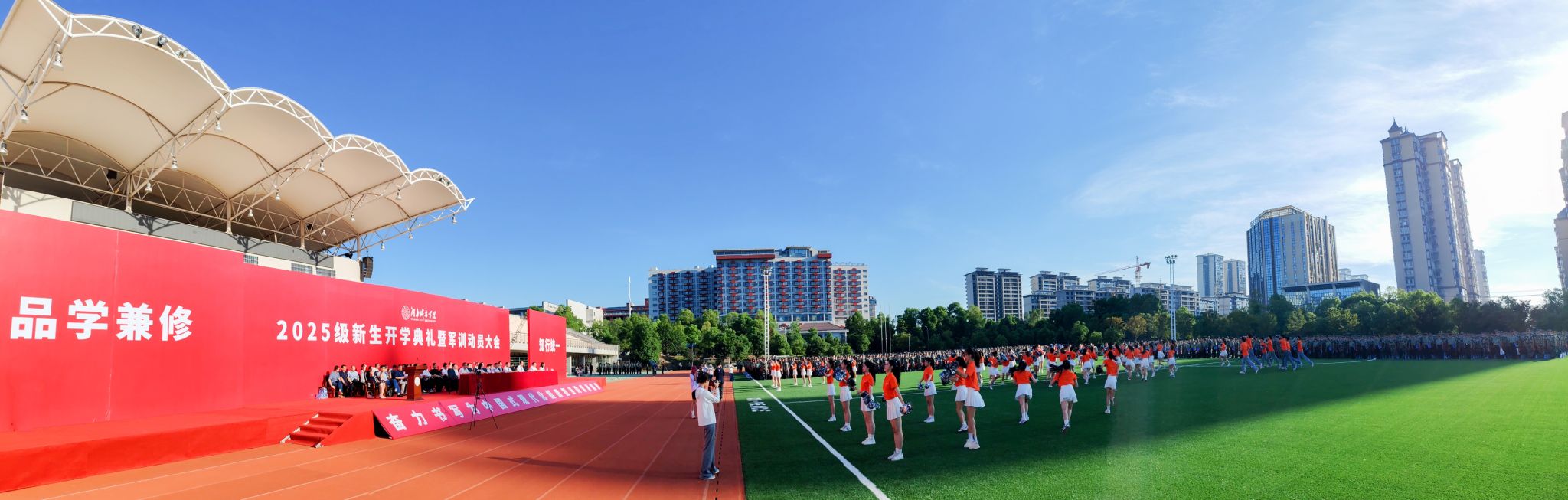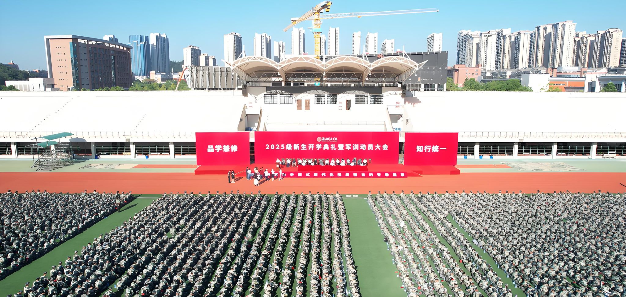 本网讯 苦尽甘来,十年寒窗终圆梦。乘风破浪,万里晴空任尔飞。9月17日上午,英亚平台2025级新生开学典礼暨军训动员大会在学校东田径场举行,6600余名2025级本科生、研究生新生承载着殷切期望、怀揣着青春梦想,在城院开启人生新征程。校党委书记何振寄语2025级新生:要以“城”之名,砥砺报国,共织城市摇篮之美,充分认识、尊重、顺应城市发展规律,探索智慧城市建设新领域,在未来城市的画卷上留下青春注脚。